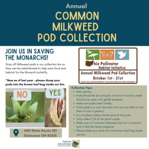 The Ohio Pollinator Habitat Initiative and Delaware SWCD are calling for Common Milkweed pods. Milkweeds are the only plant that the Monarch butterfly will lay eggs on. They also serve as a food source for Monarchs and other pollinator animals. Milkweed is the only host plant the Monarch butterfly will lay its eggs.