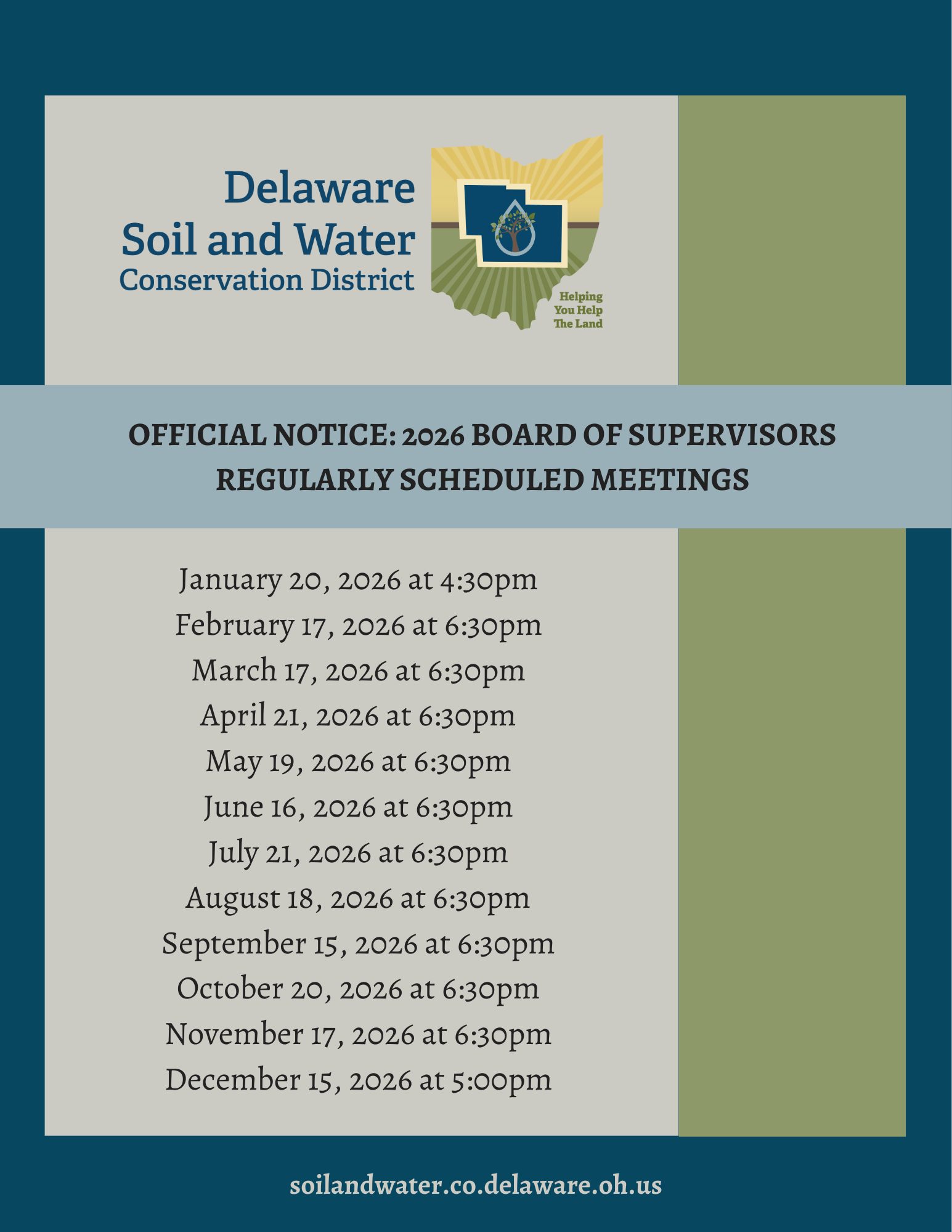 The Board of Supervisors’ board meetings are held on the 3rd Tuesday of each month, starting at 6:30 p.m. at the Delaware Soil and Water office unless otherwise noted. Board meetings are open to the public to attend. If you have a specific concern or topic of conversation to discuss, please contact the office to be added to our board meeting agenda. Official Meeting Schedule